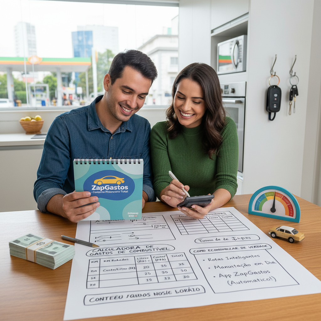 Registre cada abastecimento com o valor, a quilometragem e a quantidade de litros. Ao longo do mês, some todos os valores para ter o total gasto. Ferramentas como o ZapGastos automatizam esse processo via WhatsApp, eliminando a necessidade de planilhas manuais.